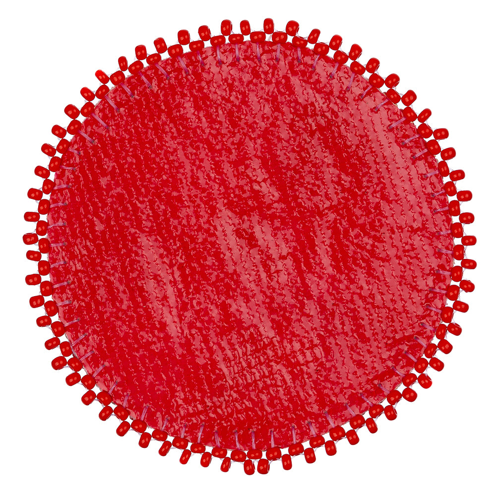 Description: Beaded rosette with leather backing. Ideal for use on native crafts such as mitts, moccasins, pouch or purse, garments, regalia, hair ties or barettes, and bolo ties. Imported.