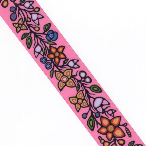 Description: Ojibway florals printed design by Jackie Traverse. This 1.5 inch satin ribbon is sold by the yard. Printed on one side. Single face, high quality ribbon. Holds up well in various applications.