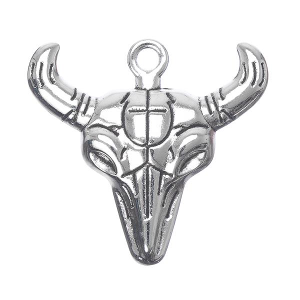 Description: Pendentif crâne de taureau en argent antique en alliage de métal. L'article mesure 29 mm de large x 28 mm de long x 4 mm d'épaisseur avec un trou de 3 mm. Sans plomb et sans cadmium.