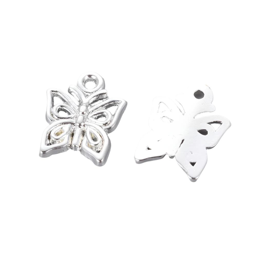Description: Breloque papillon en alliage de métal argenté. L'article mesure 13 mm de large x 15 mm de long x 2 mm d'épaisseur avec un trou de 2 mm. Sans plomb, sans cadmium et sans nickel.