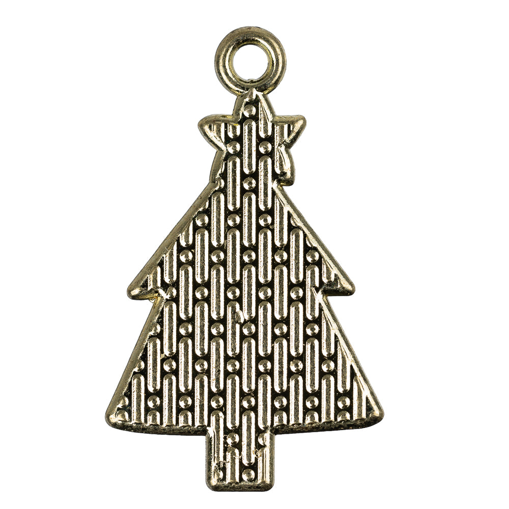 Description: Breloque sapin de Noël en métal émaillé avec placage or. L'article mesure 16 mm de large x 27 mm de long x 1,1 mm d'épaisseur, trou de 1,9 mm. Alliage de zinc.