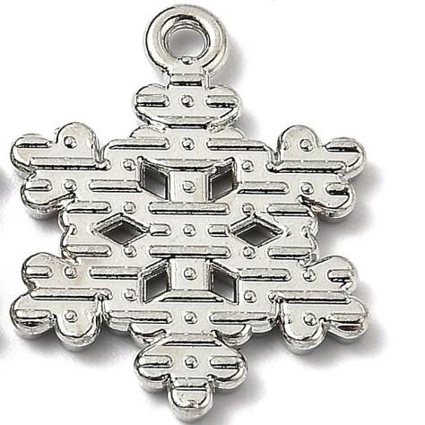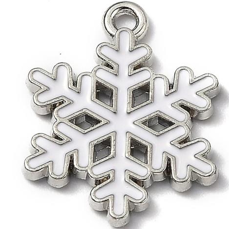 Description : Breloque en métal émaillé flocon de neige. L'article mesure 16 mm de large x 21 mm de long x 1,7 mm d'épaisseur avec un trou de 1,5 mm. Alliage de zinc.