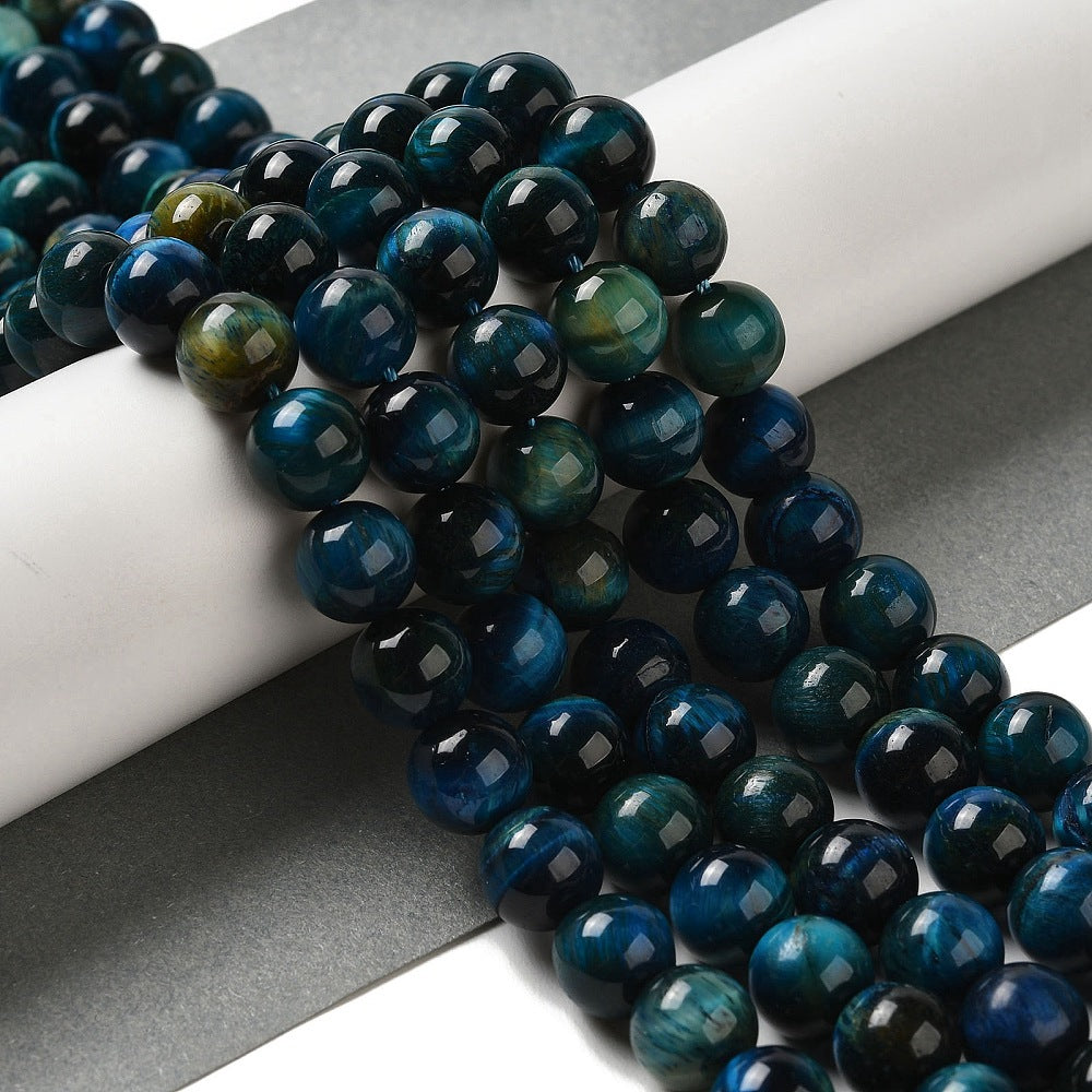These polished beads display deep shades of teal and midnight blue, with the signature chatoyancy (“cat’s-eye effect”) that makes Tiger Eye shimmer as the light moves across its surface. Enhanced through dyeing to achieve their bold colour, these beads still carry Tiger Eye’s traditional association with courage, focus, and protection. Their rich tones and glowing effect make them an excellent choice for jewellery that feels both striking and contemporary. Slight variations in colour, size, and markings are to be expected, adding to their one-of-a-kind appeal.