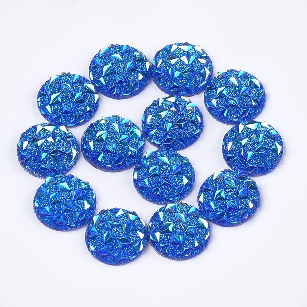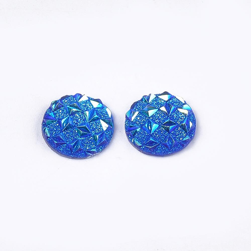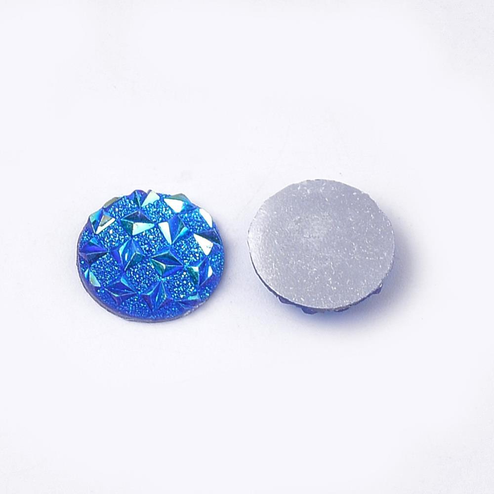 Description: Cabochon rond à dos plat en résine opaque. Mesure 12 mm.