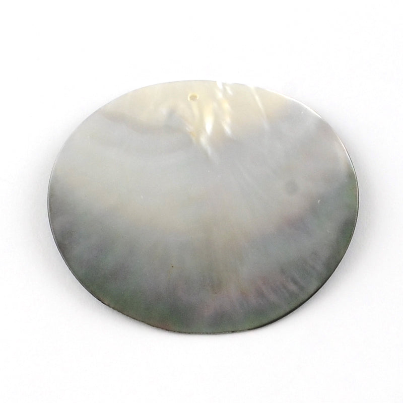 Description: Natural black lip shell flat round pendant with top hole. Measures 59-60mm x 1-3mm, 1.5mm hole. Due to the nature of the product, each pendant will vary in style and colour from picture shown.
