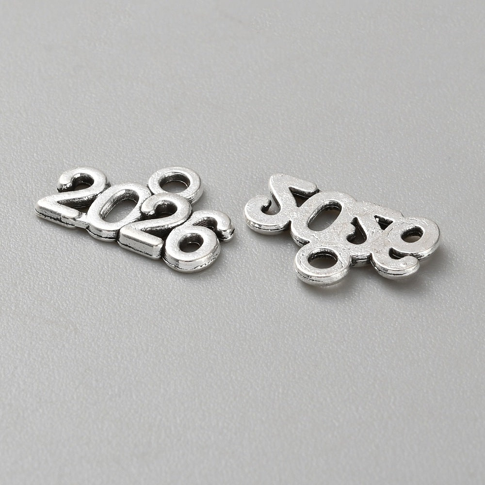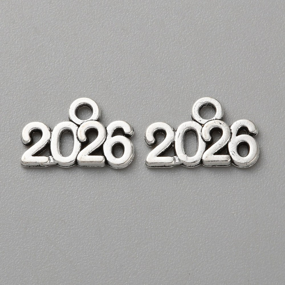 Celebrate a special milestone with these alloy “2026” charms, designed in a bright antique silver-tone finish that adds a fun, polished touch to any project. Their bold, easy-to-read numbers make them perfect for graduation bracelets, keychains, zipper pulls, memory necklaces, and personalized DIY gifts. Lightweight yet sturdy, each charm includes a top loop for quick, secure attachment to jump rings, chains, or beaded designs. A great way to mark the year in style and create keepsakes that your customers will love.