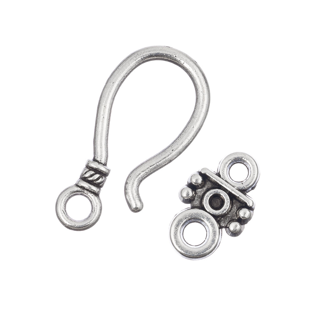 Description: Decorative antique silver plated metal hook & eye clasp. Hook measures about 11mm wide, 25mm long, Eye: about 14mm long, hole: 3.5mm. Lead free, Cadmium free.