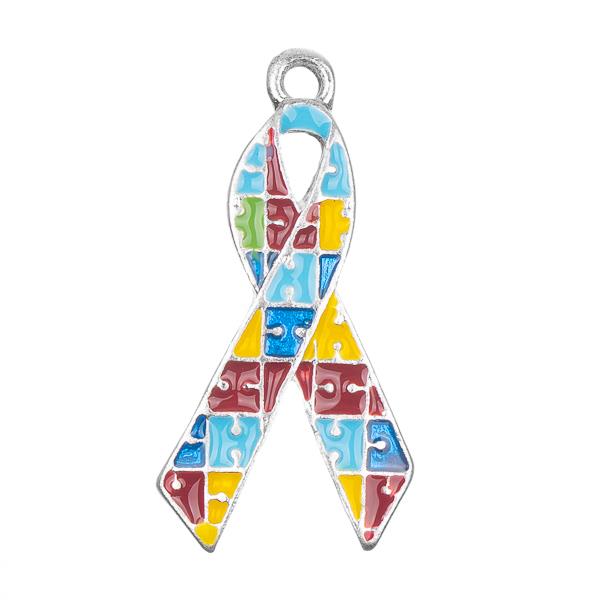 Description: Charme de puzzle de ruban de sensibilisation à l'autisme en métal émaillé multicolore avec dos de couleur nickel. Sans plomb, sans nickel.
