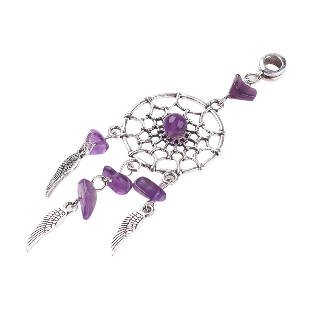 Description: Pendentif attrape-rêves plat rond en métal allié avec bélière, plumes d'ailes et pierres précieuses d'améthyste naturelle. Mesure 93 mm de long, trou : 5 mm, pendentif : 70 x 28 x 8 mm.