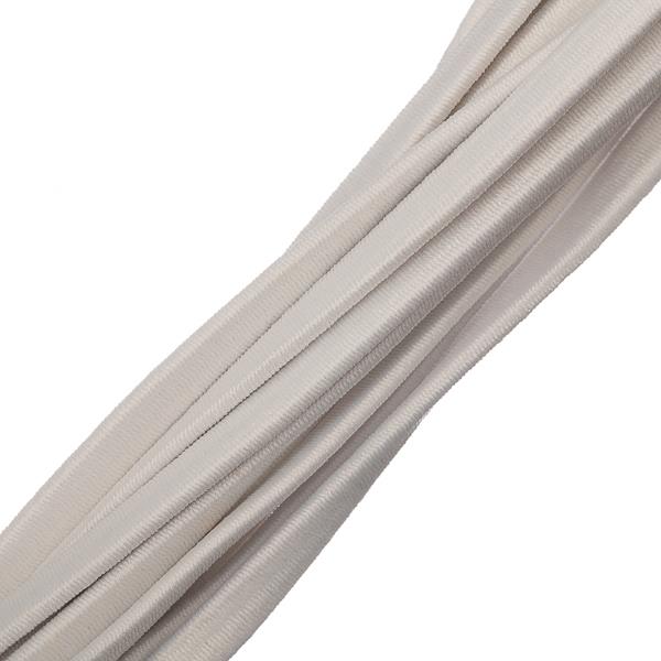 Description : cordon élastique, avec fibre à l'extérieur et caoutchouc à l'intérieur. Mesure 5 mm de large x 2 mm d'épaisseur x 5 mètres de long.