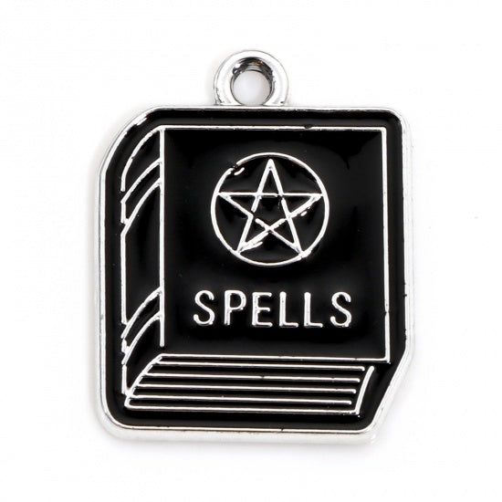 Add a touch of magic to your creations with this spell book pendant. Made from silver-tone metal and finished with glossy black enamel, it features crisp detailing on the cover, including a pentagram and the word “Spells,” giving it a bold, witchy look. Perfect for mystical necklaces, statement earrings, zipper pulls, or DIY accessories, this charm brings fun, fantasy, and a hint of dark whimsy to any handmade design.