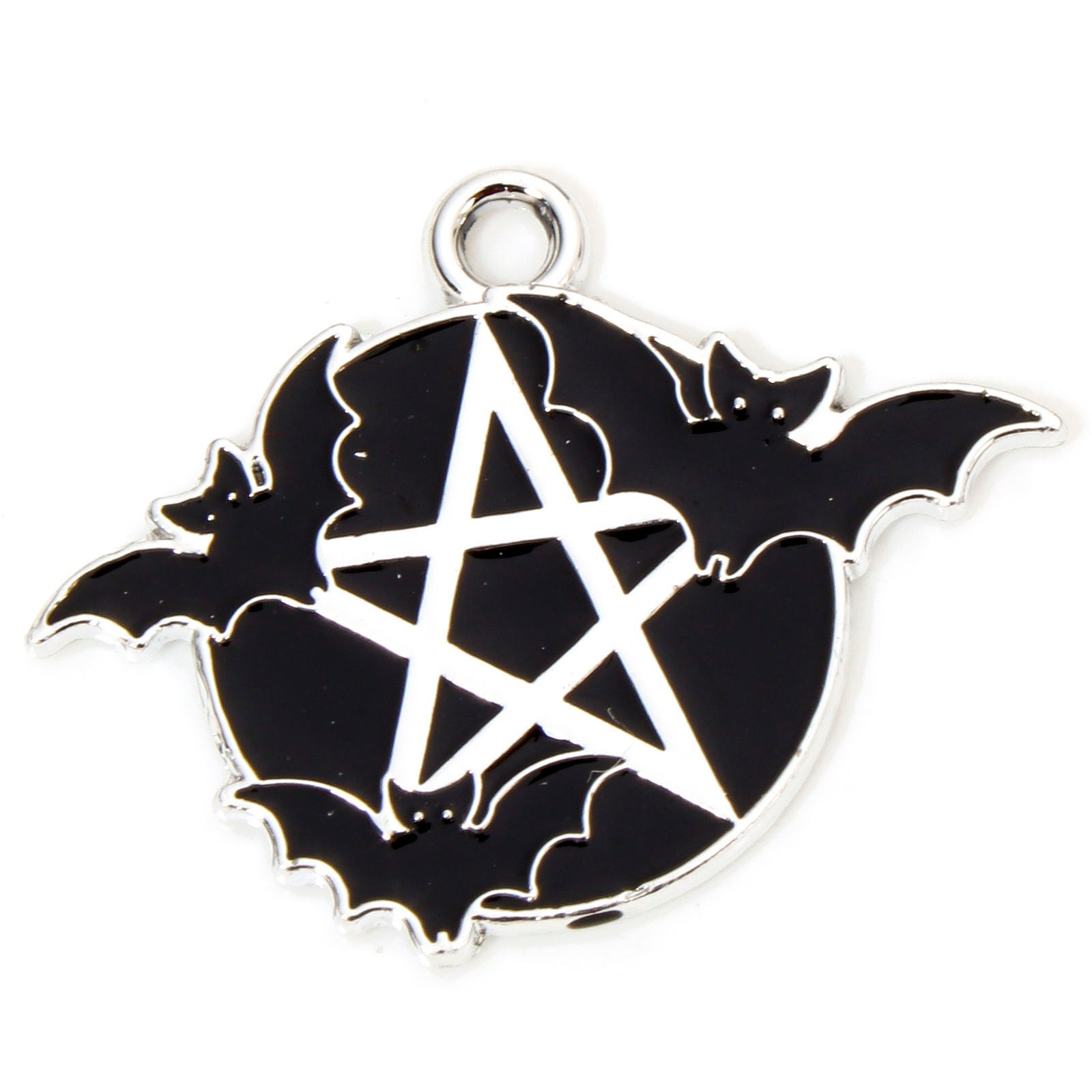 This striking pendant combines bold gothic style with smooth enamel detailing. Set in silver-tone metal, it features a bright white pentagram framed by glossy black enamel and surrounded by three flying bats for a dramatic, Halloween-ready look. Perfect as a focal point for necklaces, statement earrings, chokers, or dark-themed DIY accessories, this pendant brings edgy, mystical flair to any handmade creation.