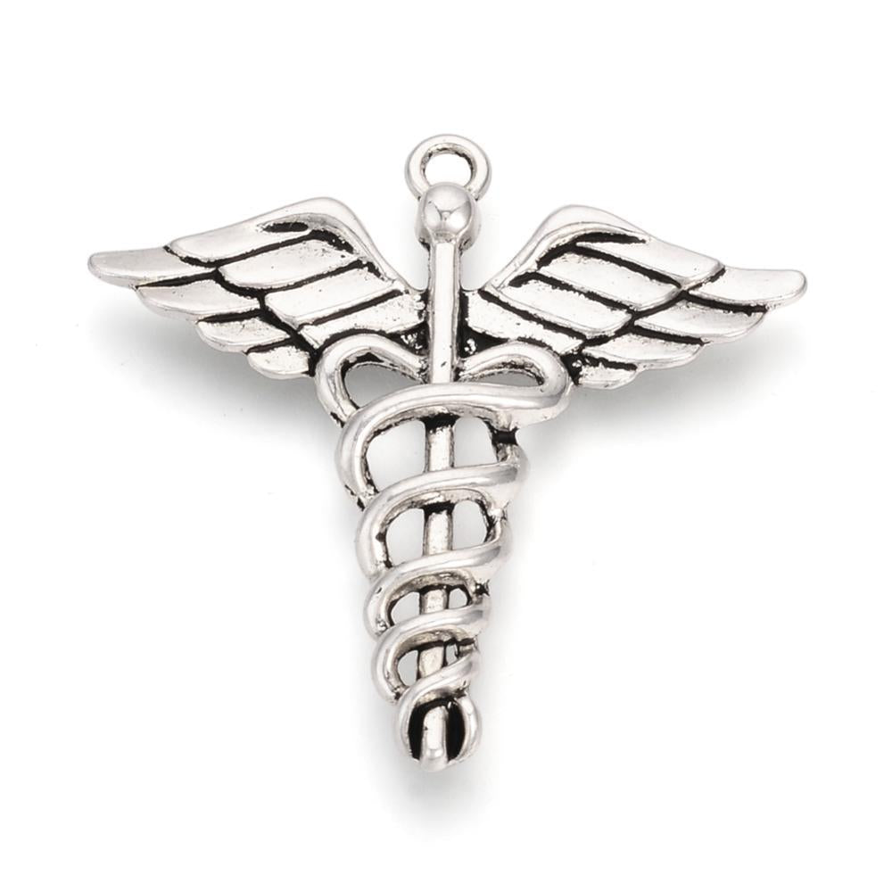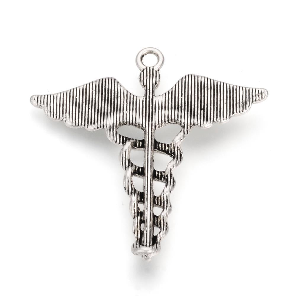 Description: Breloque médicale caducée en métal. L'article mesure 39,5 mm de large x 40 mm de long x 4 mm d'épaisseur. Alliage de zinc. Sans plomb, sans cadmium.