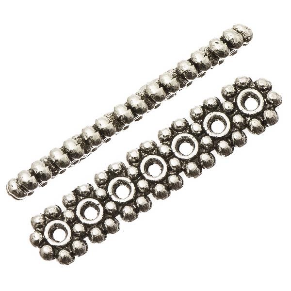 Description : Entretoise métallique en alliage de zinc. Mesure 5 mm x 23 mm, trou de 1 mm. Sans plomb, sans cadmium.