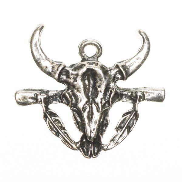 Description: Crâne de taureau avec pendentif en métal plumes. Idéal pour les bijoux et l'artisanat amérindien. Mesure 31 mm (l) x 28 mm (l) x 2,3 mm (t), trou de 2,5 mm.