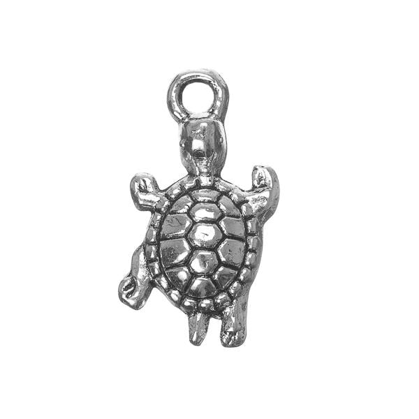 Description: Breloque tortue en métal argenté antique en alliage de zinc. L'article mesure 12 mm de large x 23 mm de long x 4 mm d'épaisseur x 2 mm de trou. Sans plomb, sans cadmium.