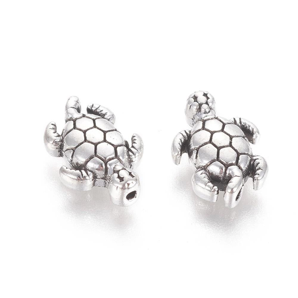 Description: Perle de tortue en argent antique avec trou vertical. L'article mesure 9 mm de large x 13 mm de long x 4 mm d'épaisseur avec un trou de 1 mm. Métal en alliage de zinc. Sans plomb, sans nickel, sans cadmium.