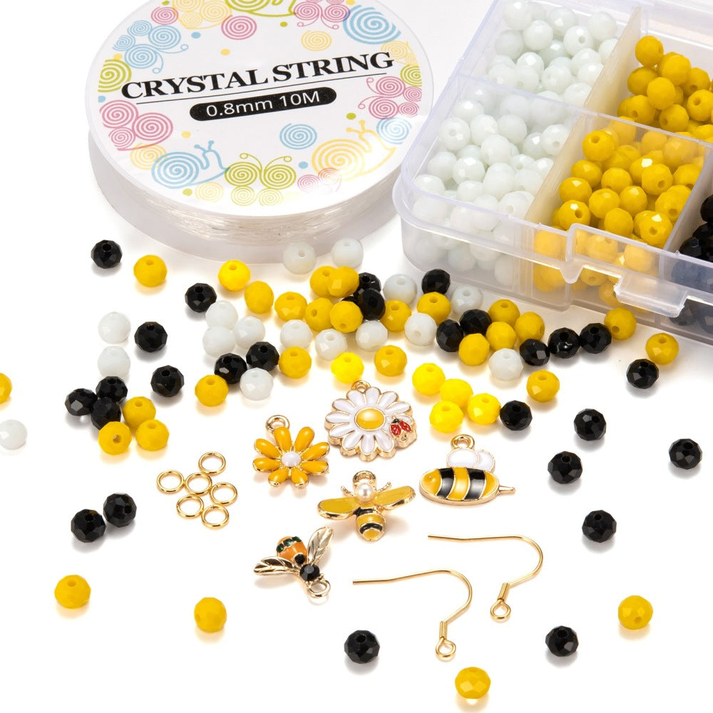 Description: Bee / Flower Bracelet and Earring Making Kit includes Glass Beads, 5 Style Alloy Enamel Pendants, 304 Stainless Steel Earrings Hooks & Jump Rings, and Elastic Cord.