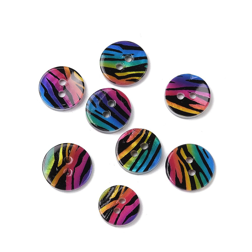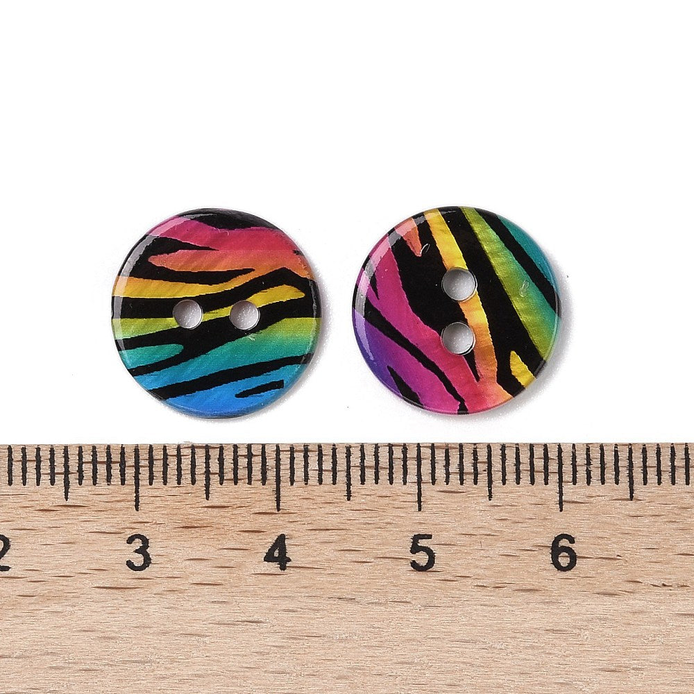 Description: Flat round colourful freshwater shell button, 2 hole. Each button measures approximately 14mm in diameter, 2mm thick, hole: 2mm. Due to the nature of this product, each button will vary in style, size, and colour.