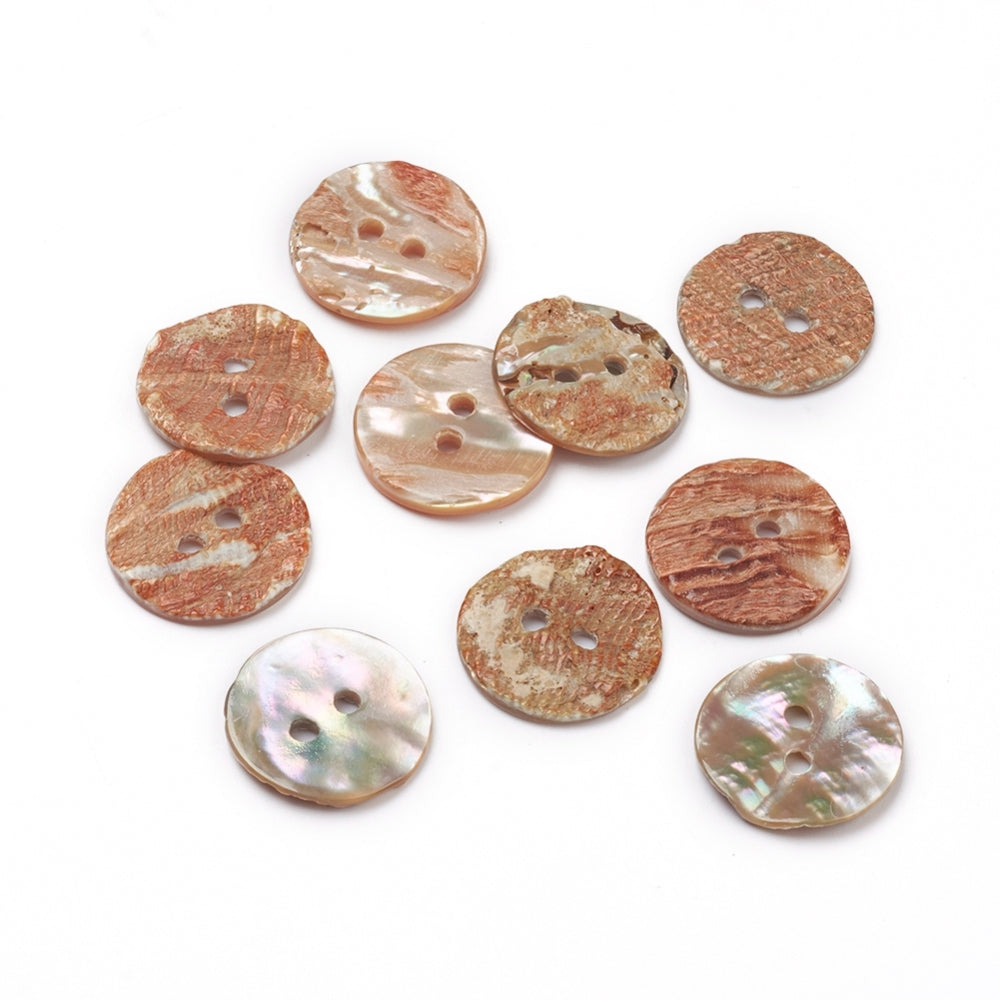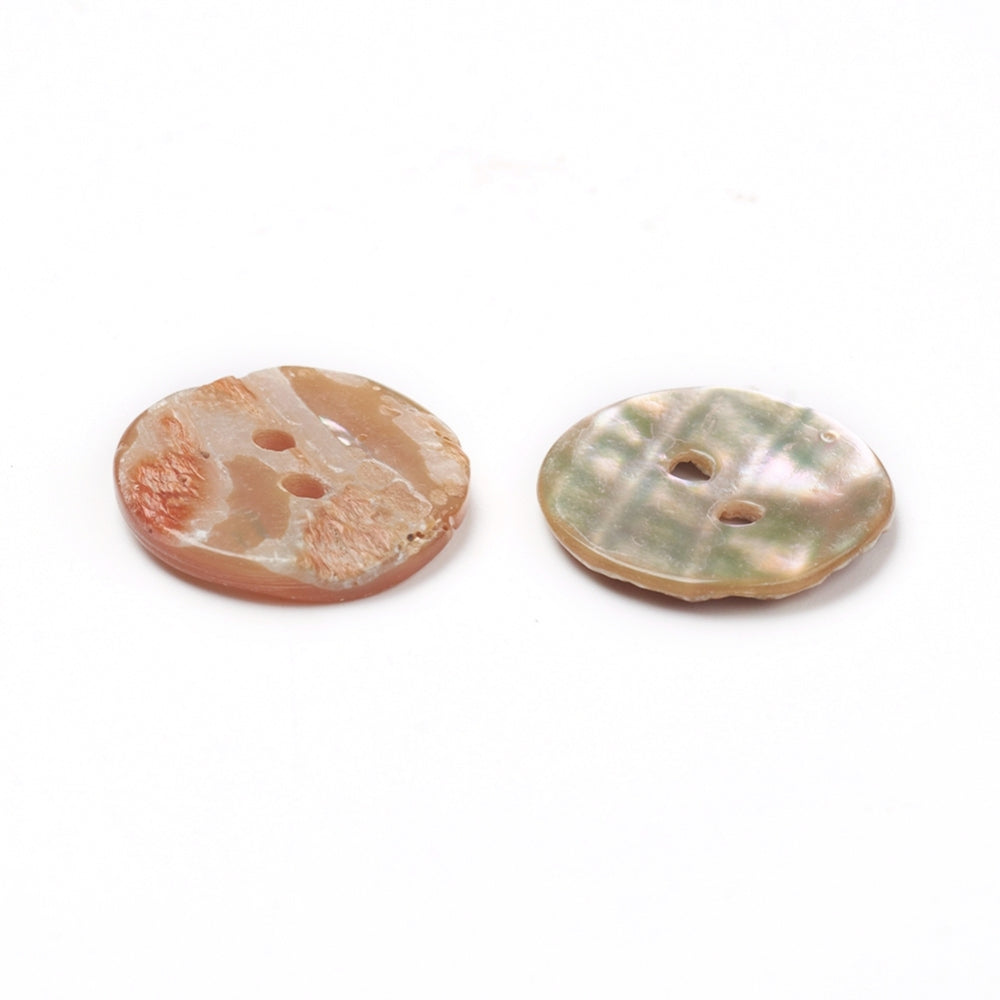 Description: Flat round abalone / paua shell button, 2 hole Coral. Each button measures approximately 15mm in diameter, 2mm thick, hole: 1.8mm. Due to the nature of this product, each button will vary in style, size, and colour.