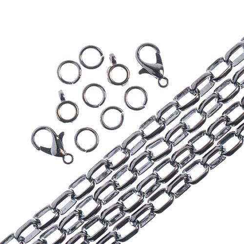 Description : Chaîne et résultats correspondants. Chaque ensemble comprend une chaîne de 36 pouces, 6 anneaux de saut, 2 bélières et 2 fermoirs de homard. Métal : Fer.
