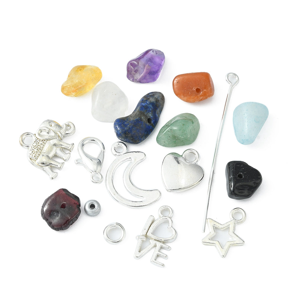 Description: Jewelry Making Kit includes Natural Gemstone Chip Beads, glass seed beads, elephant, heart and star pendants, clasps, jump rings and eye pins.