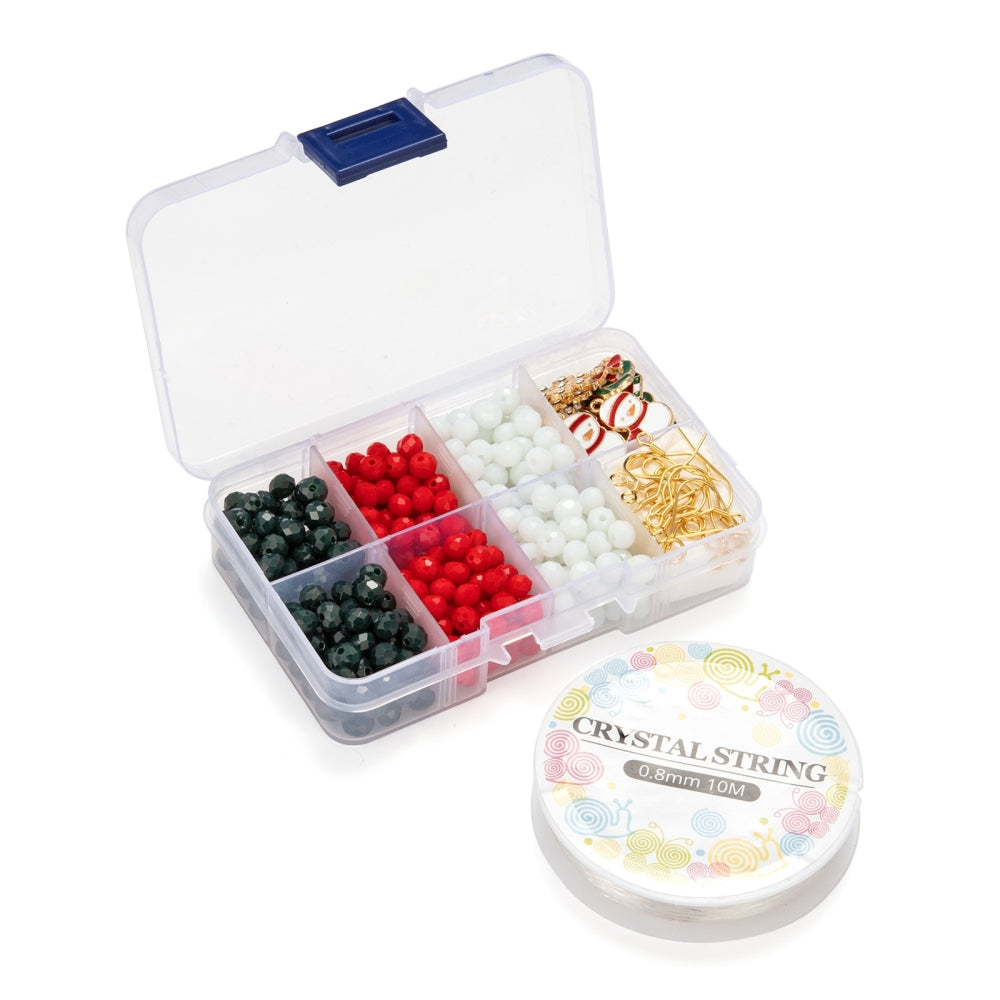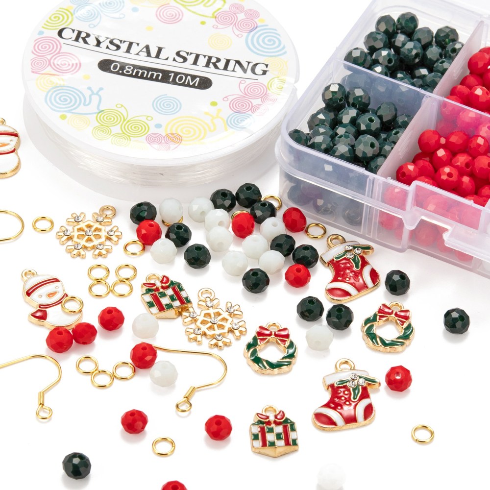 Description: Christmas Bracelet and Earring Making Kit includes Glass Beads, 5 Style Alloy Enamel Pendants, 304 Stainless Steel Earrings Hooks & Jump Rings, and Elastic Cord.
