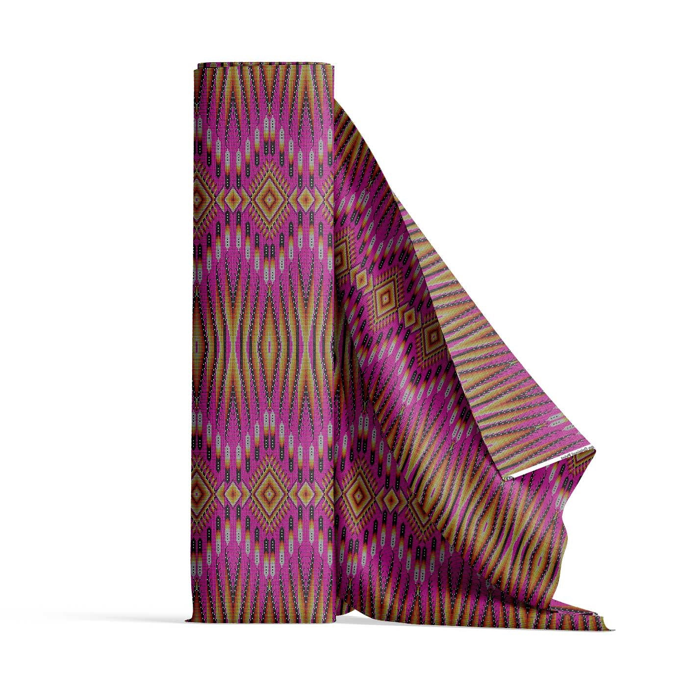 This cotton fabric features beadwork-inspired diamond medallions with cascading feather motifs, creating flame-like movement that evokes ceremony, strength, and cultural storytelling in a design that feels dynamic and powerful. Lightweight yet versatile, it is perfect for ribbon skirts, regalia accents, powwow accessories, and star quilts, while also lending itself beautifully to tote bags, table runners, and wall hangings that honor tradition. Sold by the half yard; multiple quantities are sold in one continuous cut. Pre-wash and dry before sewing to prevent shrinkage. Machine wash cold with like colours; tumble dry low; warm iron.