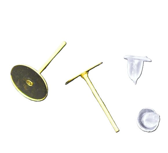 Description : Boucles d'oreilles en alliage plaqué or avec coussinet plat de 8 mm. Mesure 12 mm de long avec une broche de 0,7 mm. Comprend 100 supports en caoutchouc.