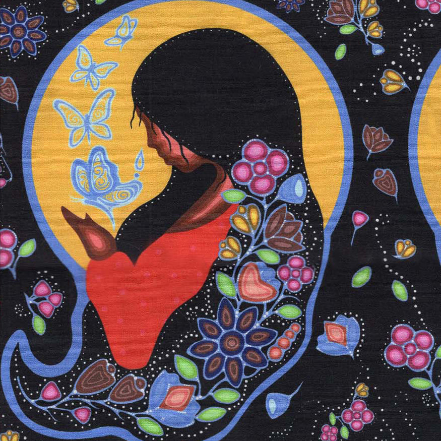 This cotton fabric features Jackie Traverse’s “Heal” paintine: a woman in a red dress catches her tears as they rise as butterfly spirits amid memorial florals—an MMIWG2S tribute symbolizing healing and growth. Lightweight yet versatile, it’s ideal for ribbon skirts, regalia accents, star quilts, shawls, tote bags, and wall hangings. Sold by the half yard; multiple quantities are sold in one continuous cut. Pre-wash and dry before sewing to prevent shrinkage. Machine wash cold with like colours; tumble dry low; warm iron.