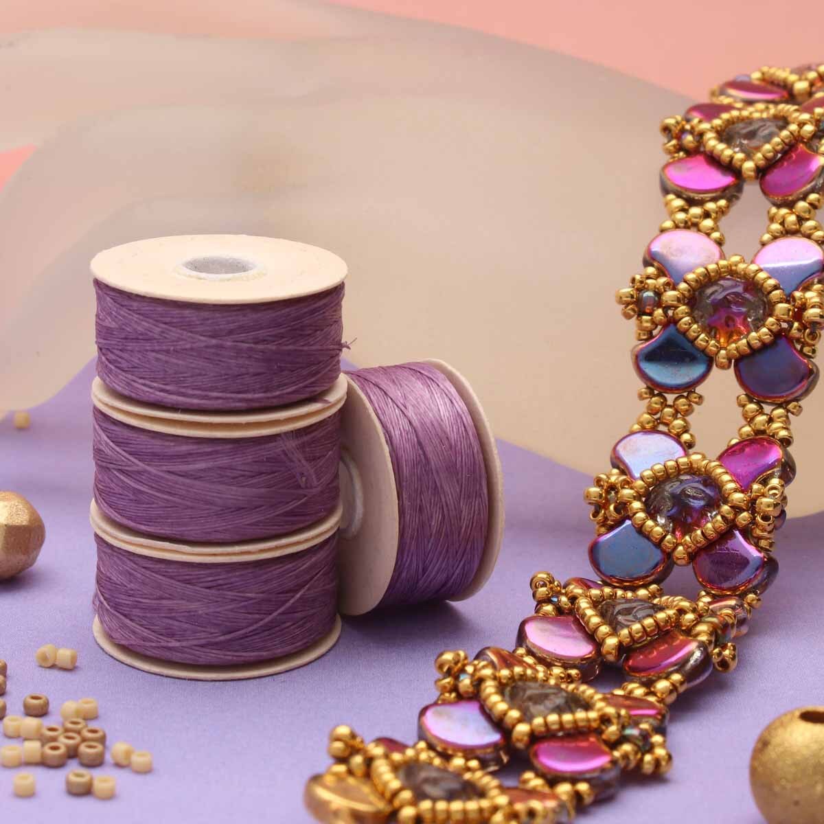 Description : Nymo est l'un des fils de perles en nylon les plus populaires pour les perles de rocaille. Il s'agit d'un monocorde en nylon, qui est un filament de fibre à liaison unique non torsadé. Ceci est utile pour le perlage, en particulier lorsque vous devez retirer des points de suture - il ne se déformera pas et ne se séparera pas. Le fil Nymo est solide et souple, mais il peut s'effilocher lorsqu'il est surmené. Nymo est utilisé avec des perles de rocaille en verre pour le tissage sur métier à tisser, la couture de perles hors métier et la broderie de perles ou comme fil de trame dans les perles de métier à tisser. Il est particulièrement adapté à la confection de bijoux avec des pompons et des franges solides mais avec un mouvement souple. Sa flexibilité signifie qu'il peut passer à travers les billes plusieurs fois. La taille B est de 0,2032 mm et l'une des épaisseurs les plus couramment utilisées. Il convient à une large gamme de points et de tailles de perles, y compris les perles de taille 8, 10, 11 et 15.