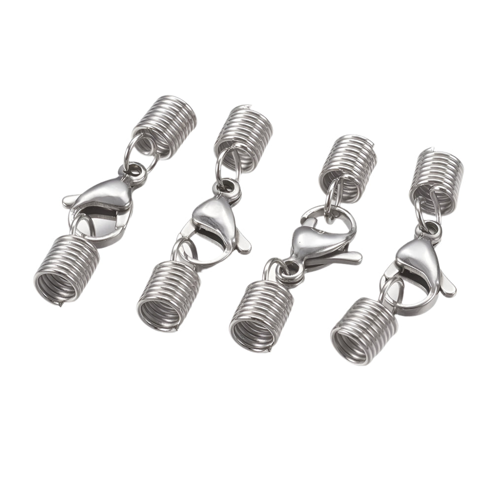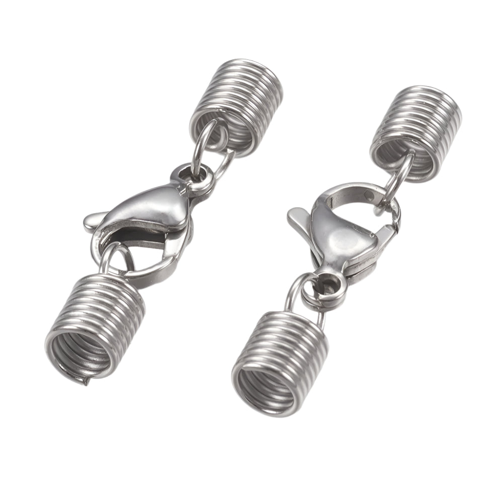 Description: Lobster claw clasp with cord ends. Use with any round cord up to 2mm in diameter. Cord ends are used by inserting the cord into the slot with a touch of glue, then pinching the tip of the coil down with a pair of pliers to secure into place. Size: about 23mm long, lobster clasps: 9x6x3mm; cord ends: 8x3mm, inner diameter: 2mm. 304 Stainless Steel.