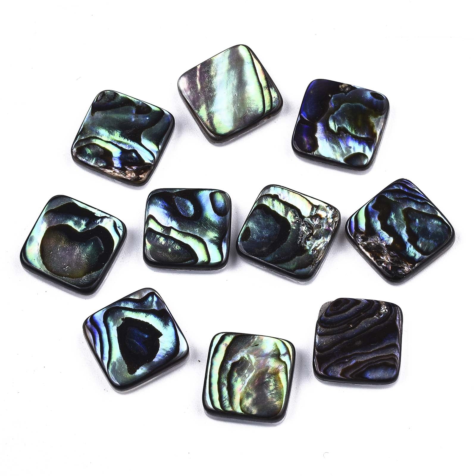 Description: Natural abalone shell square cabochons with freshwatershell backing. Used for making beaded earrings, pendants, and more. This item measures 10mm wide x 3mm thick.