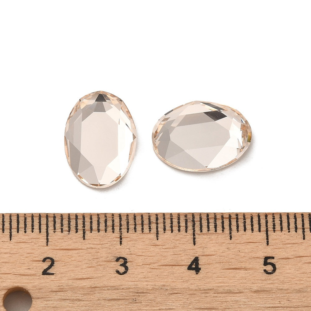 Description: Glass faceted rhinestone cabochons. Flat back and back plated. Used for making beaded earrings, pendants, and more. This item measures 14mm long x 10mm wide x 3.5mm thick.
