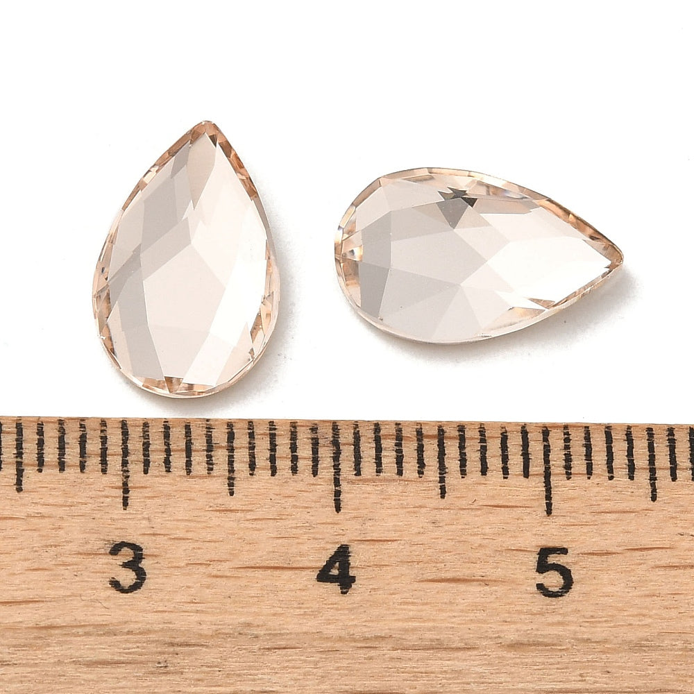 Description: Glass faceted rhinestone cabochons. Flat back and back plated. Used for making beaded earrings, pendants, and more. This item measures 14mm long x 9mm wide x 3.5mm thick.