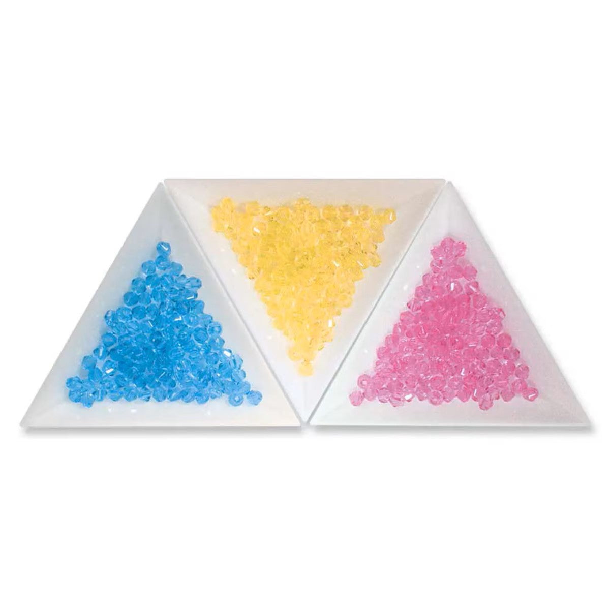 Description : ce plateau de tri de perles a une forme triangulaire, ce qui facilite le ramassage de vos perles, strass ou résultats. Triez vos perles dans le plateau pendant que vous travaillez. Lorsque vous êtes prêt à ranger vos perles, versez-les directement du coin dans vos sacs, tubes, contenants ou compartiments ! Les bords inclinés vous permettent également de les utiliser comme pelles à perles pour chasser les perles lâches. L'ensemble comprend trois plateaux en plastique triangulaires de 3 pouces. Compacte et portative. Ces plateaux légers mesurent 3 pouces de largeur (par côté) x 1/2 pouce de hauteur et sont empilables pour un stockage compact.