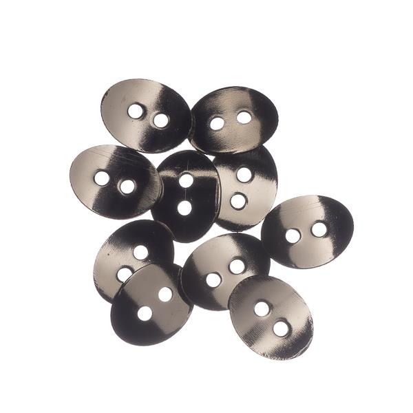 Description: Oval brass base metal button with two holes. Measures 10mm x 14mm x 1mm, with 2mm holes.