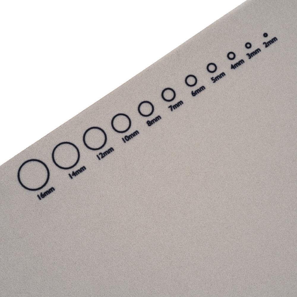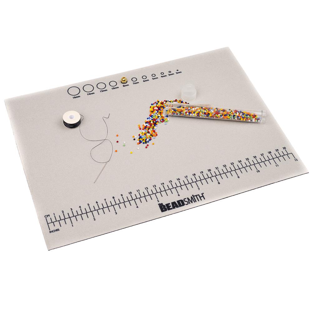 Description: This durable padded beading mat is made of a non-slip, natural rubber base and a durable padded surface. The top of the mat is soft, which helps prevent beads from rolling around! The mat has laser printed measurements on the surface. One side are round bead diameters, a visual guide of bead sizes from 2mm to 16mm. This is a nice feature when you have many pieces on your mat and you need to keep a bead as reference when writing down instructions for your newest masterpiece. The other side is a very handy ruler, which makes measuring quick and easy while working on projects. Measurements are conveniently listed in both inches and centimeters. The mat is completely flat and functions as a general work surface. The mats are excellent for seed beads or other craft projects where a bead board is not required, and you need more room to spread out. The large size will accommodate tools and accessories as well as your project. This is a great addition to your storage supplies kits.