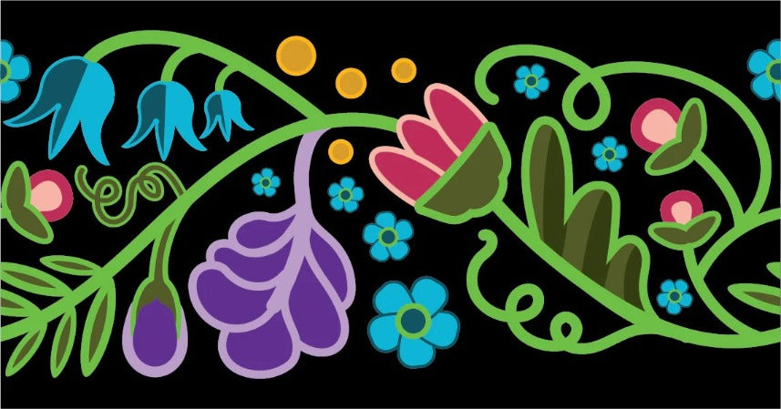 Description: This design is by Metis artist Victoria Scattergood and is representative of traditional Metis beadwork on black velvet. The black background makes the colorful beadwork pop. This 2 inch satin ribbon is sold by the 20 yard roll. Printed on one side. Single face, high quality ribbon. Holds up well in various applications.