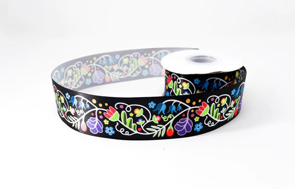 Description: This design is by Metis artist Victoria Scattergood and is representative of traditional Metis beadwork on black velvet. The black background makes the colorful beadwork pop. This 2 inch satin ribbon is sold by the yard from a 20 yard roll. Printed on one side. Single face, high quality ribbon. Holds up well in various applications.