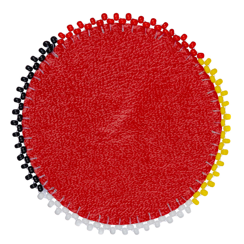 Description: Beaded rosette with faux leather backing. Ideal for use on native crafts such as mitts, moccasins, pouch or purse, garments, regalia, hair ties or barettes, and bolo ties. Imported.