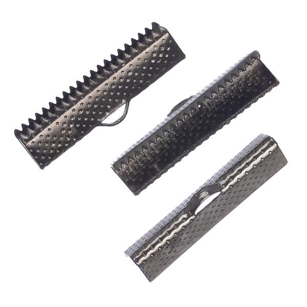 Description: Hide your unfinished ribbon or leather ends with these crimps. Simply press together with your flat nose pliers to securely hold your material. Attach a jump ring to connect it to a clasp, key chain or other findings. Iron based metal, measures about 25mm long, 8mm wide, 5mm thick, hole: 1mm