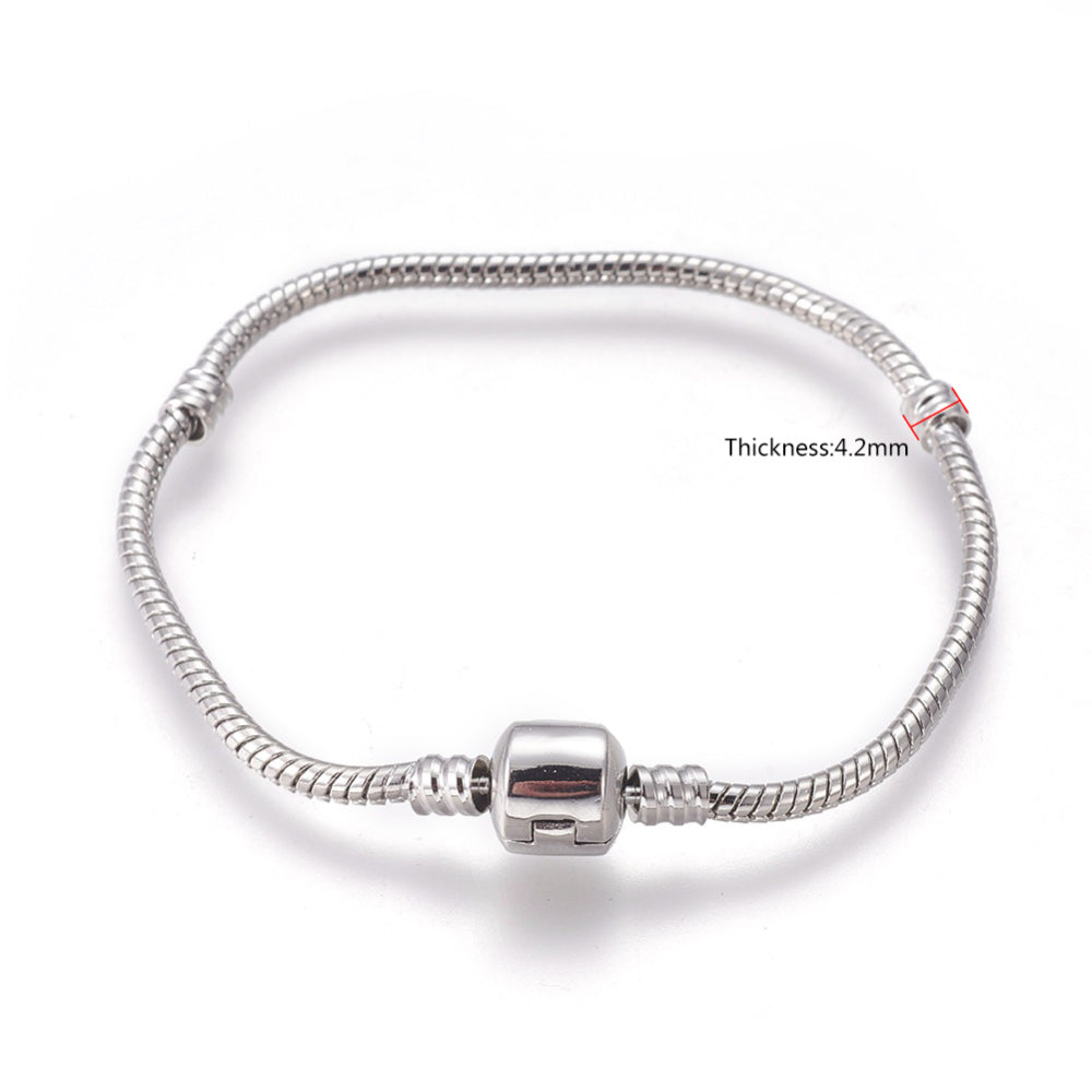These Brass European Pandora Style Bracelets are crafted with a sleek platinum finish and feature a smooth, durable snake chain design. The bracelet includes a matching brass clasp, offering a clean and versatile base ideal for adding European-style beads and charms. Perfect for DIY jewelry projects, these bracelets provide a polished, high-quality foundation for creating personalized and stylish accessories.