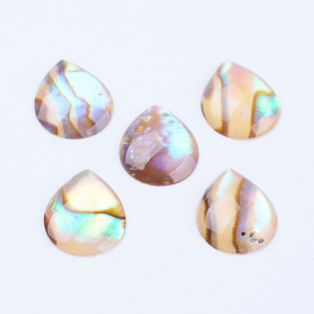 Description: Natural paua shell cabochons. Used for making beaded earrings, pendants, and more. This item measures 8mm wide x 10mm long x 1-1.5mm thick.