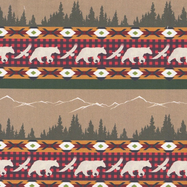 This cotton fabric features bold Aztek stripe patterns with silhouetted bears and soaring birds set between forest lines and mountain horizons, blending geometric accents with nature imagery for a design that feels rugged, rhythmic, and full of storytelling. Lightweight yet versatile, it is perfect for ribbon skirts, regalia accents, star quilts, and shawls, while also lending itself beautifully to tote bags, table runners, and wall hangings that honor tradition and the outdoors. Sold by the half yard; multiple quantities are sold in one continuous cut. Pre-wash and dry before sewing to prevent shrinkage. Machine wash cold with like colours; tumble dry low; warm iron.