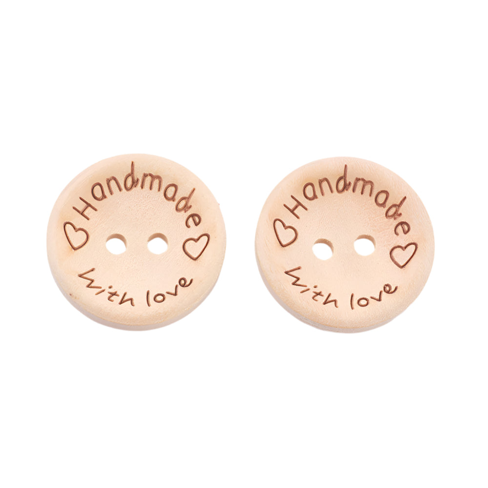 Description: Flat round wood Handmade with Love button. Each button measures approximately 20mm wide x 4mm thick, with 2mm holes. Due to the nature of this product, each button will vary in style, size, and colour.