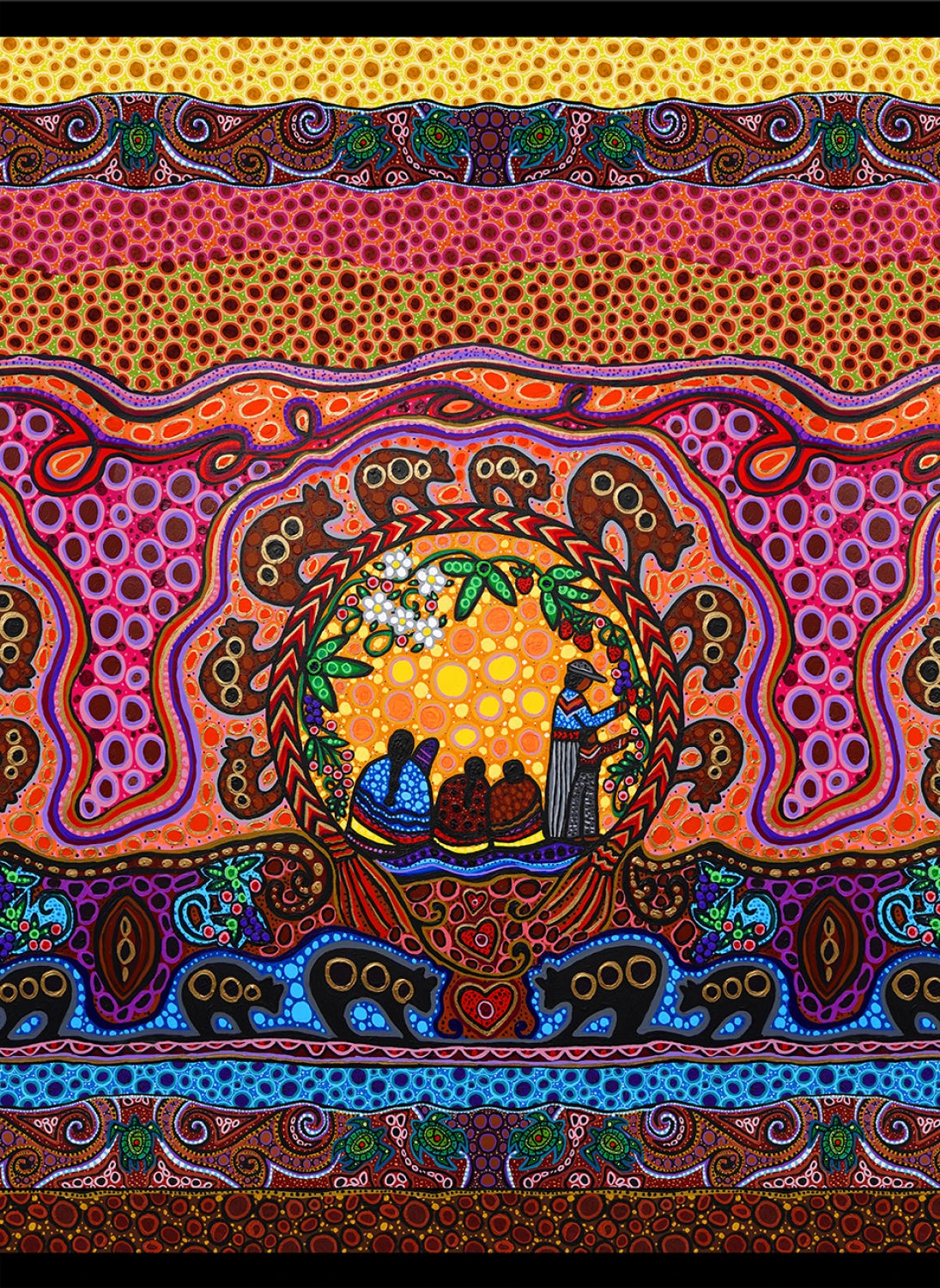 This cotton fabric showcases Family Circle by Métis artist Leah Marie Dorion, honouring kinship, teaching, and the land through radiant sun circles, flowing dot-work, and storytelling bands filled with animal symbols. The richly layered artwork brings warmth and meaning to ribbon skirts, regalia accents, star quilts, and shawls, and also suits tote bags, table runners, cushion covers, and wall hangings that celebrate Indigenous creativity. Sold by the half yard; multiple quantities are provided in one continuous cut. Pre-wash and dry before sewing to prevent shrinkage. Machine wash cold with like colours; tumble dry low; warm iron.