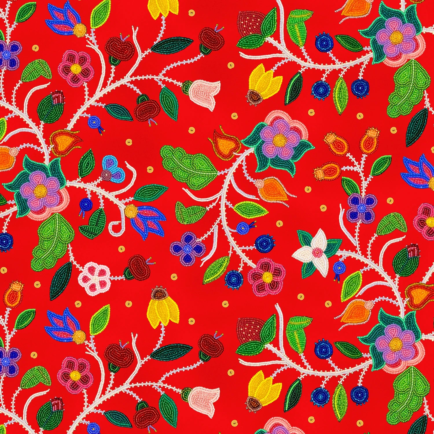 This cotton fabric features elegant beadwork-inspired floral motifs by Ojibwe artist Jessica Leigh Gokey, celebrating tradition, storytelling, and artistry through a design that feels both vibrant and meaningful. Rich in detail and movement, the floral pattern brings striking beauty to ribbon skirts, regalia accents, star quilts, and shawls, while also suiting tote bags, table runners, and wall hangings that showcase Indigenous creativity. Sold by the half yard; multiple quantities are sold in one continuous cut. Pre-wash and dry before sewing to prevent shrinkage. Machine wash cold with like colours; tumble dry low; warm iron.