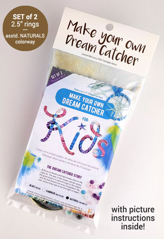 DYI Dream Catcher Kits for Kids in assorted natural colorways. Each kit makes two 2.5" dream catchers. Comes with an easy to follow picture instructions.