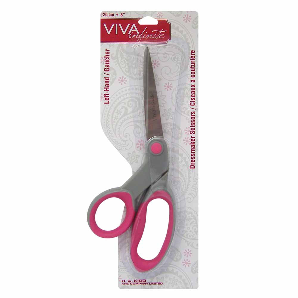 VIVA INFINITE Dressmakers' Shears – Left Handed – 8″ (20.3cm) are specially designed for fabric cutting with left-handed comfort and precision. Featuring a bent handle with a full-finger grip, they keep fabric flat on the table to ensure accurate cutting and protect the cutting surface. Crafted with tempered stainless steel and fully ground blades, these shears offer smooth, clean cuts. The ergonomic soft grip handle provides comfort and control, making them perfect for sewing, quilting, and tailoring projects.